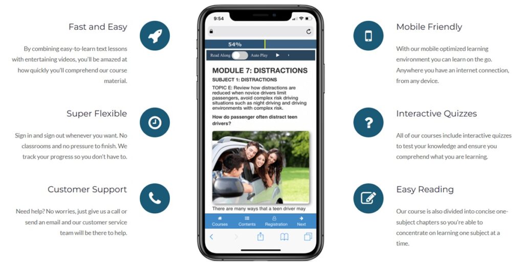 The course uses a variety of interactive materials, such as text lessons, videos, animations, quizzes, and practice tests. This teaching method helps to drive the lesson home and prepare students for the final DMV exam.